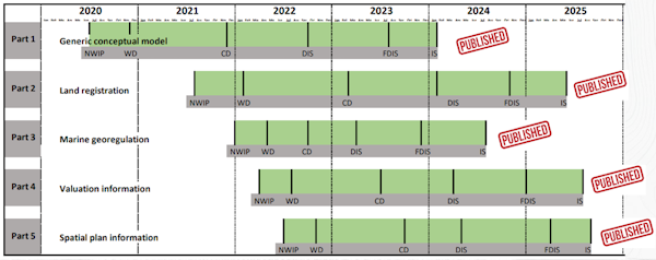 As of June 2025, the progress of the project is described in a full progress report, in which status of each part of LADM Edition II is outlined: