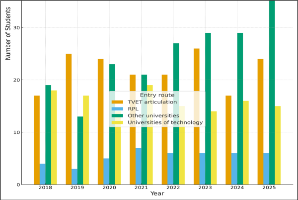 Alternative access routes became increasingly prominent. Students entered through recognition of prior learning assessments and articulation from Technical and Vocational Education and Training colleges, pathways that were formally incorporated into admission requirements for the new programmes. As illustrated in Figure 5, these routes expanded over time and contributed to participation by non-traditional students.