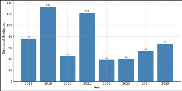 Retention rates remained relatively high across the review period, generally ranging between 80 and 90 percent, with temporary declines during the pandemic and recovery from 2022 onwards. Graduation patterns reflected both extended time to completion and the phased closure of legacy qualifications, with many students in undergraduate 3-year programmes requiring four years to complete qualifications. As illustrated in Figure 7, graduation numbers declined during the transition period and increased from 2023 as cohorts from the new Higher Education Qualifications Sub-Framework–aligned programmes reached completion. Peaks in graduation in 2019 and 2021 corresponded with accelerated module offerings to support completion of legacy programmes prior to closure.